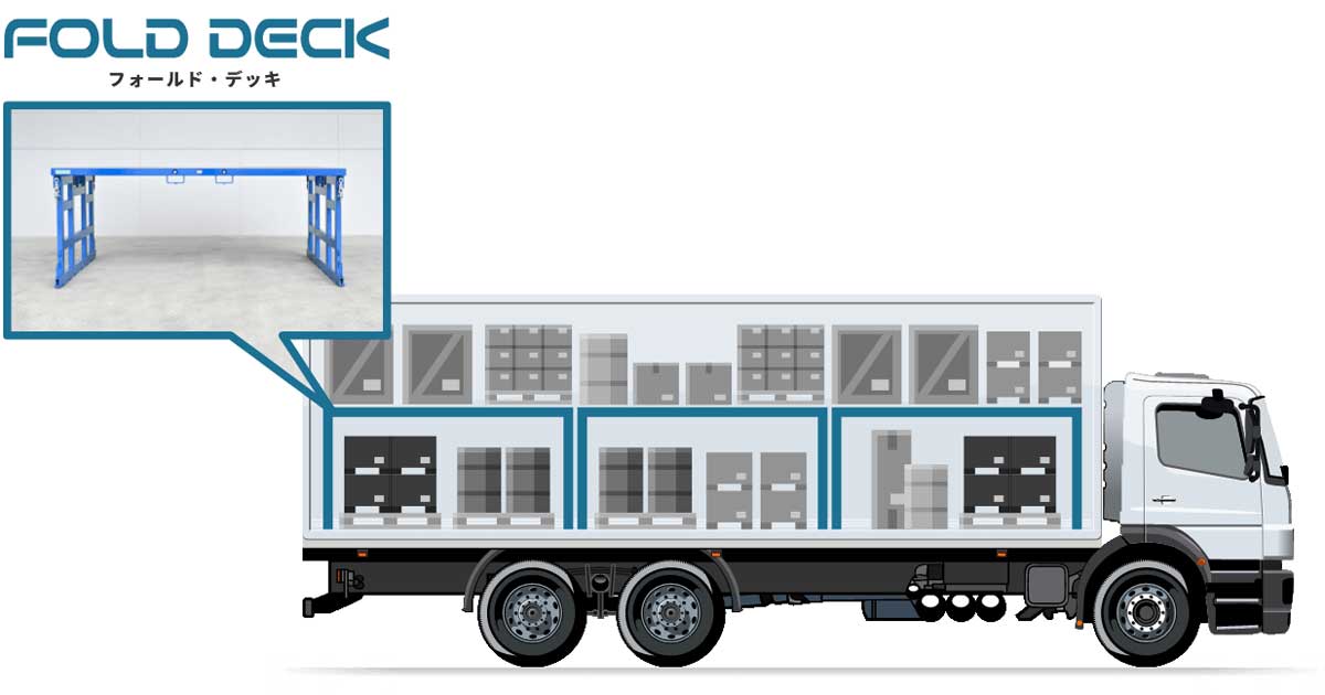 この「フォールド・デッキ」は、積載許容重量2000kg(等分布荷重)の架台。緻密な構造計算と輸送テストにより、高重量貨物にも対応できる頑強性と安定性を実現しており、一般的な荷物はもちろん、輸送時の破損リスクが高い荷物や精密機器、金属製品などの重量物の二段積み輸送を可能にしている。