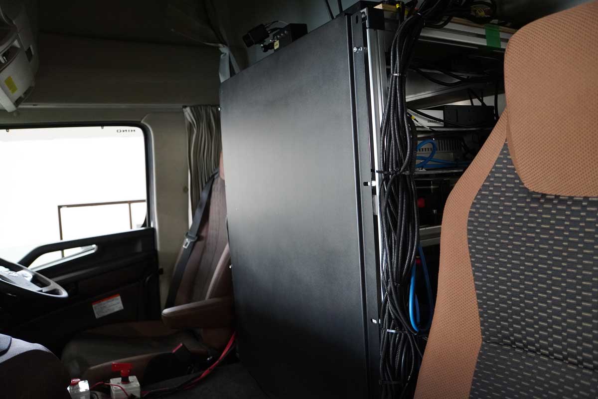 現在は実証実験中という事もあり、走行テスト時はドライバーとサポートスタッフの2名が乗り、データ収集を重ねている。自動運転を行うのは高速道路上だけのため、高速道路までは通常のトラック同様、ドライバーが運転。高速道路まで到着するとスイッチを押して自動運転に切り替え、目的のインターチェンジまで自動運転で走行、高速道路を降りると再びドライバーの運転となる。なお、自動運転中にステアリングやアクセル、ブレーキを操作すると瞬時に自動運転から手動運転に切り替わるシステムとなっている。