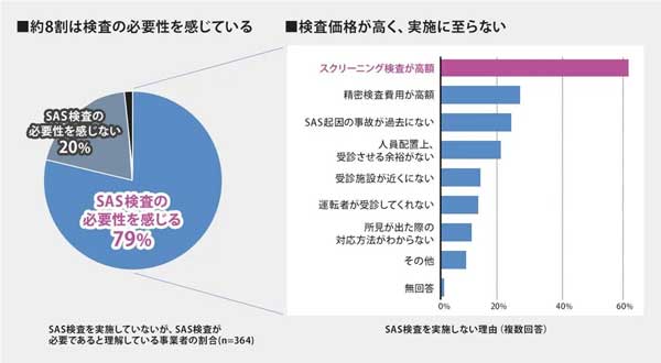 運輸・運送業界は、国土交通省から睡眠時無呼吸症候群(SAS)のスクリーニング検査について「基本は運転者全員を対象に実施」と示されているものの、トラック業界で約4割(従業員数50人以下では3割)しか受診していないのが実状。