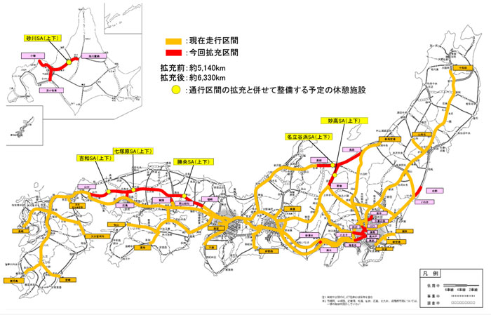 物流事業者のニーズ等を踏まえ、北海道、首都高速、阪神高速での通行区間を初めて追加するほか、災害時の迂回路となる上信越道、北陸道、中国道等でも拡充した。