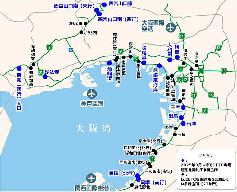 阪神高速道路は、3月から6月頃の間で順次、新たに28カ所の料金所について、ETC専用料金所として運用を開始する。