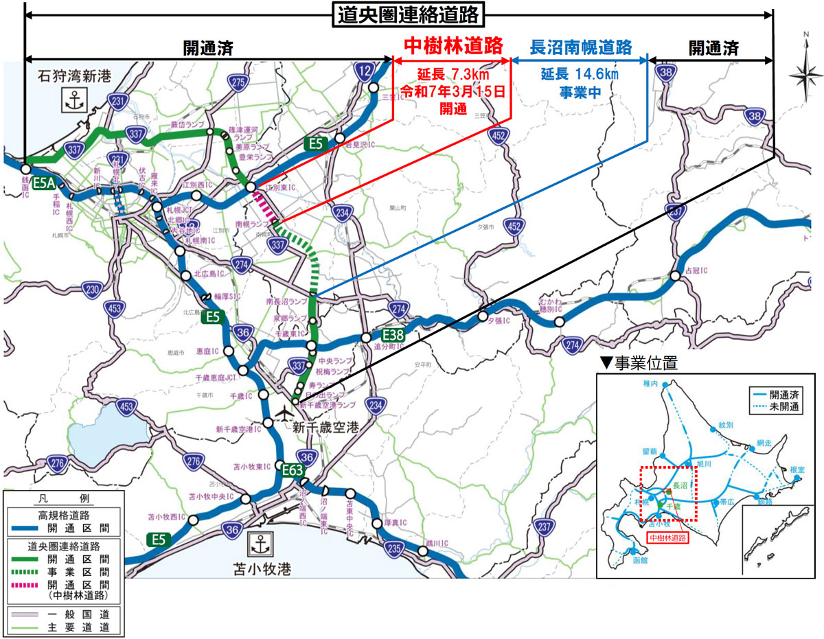 道央圏連絡道路は、千歳市を起点とし、小樽市に至る高規格道路。中樹林道路は、北海道縦貫道江別東ICと接続し、高速ネットワークの拡充による札幌圏の連絡機能の強化を図り、地域間交流の活性化や拠点空港新千歳空港、国際拠点港湾苫小牧港等への物流効率化等の支援を目的として整備を進めてきた。