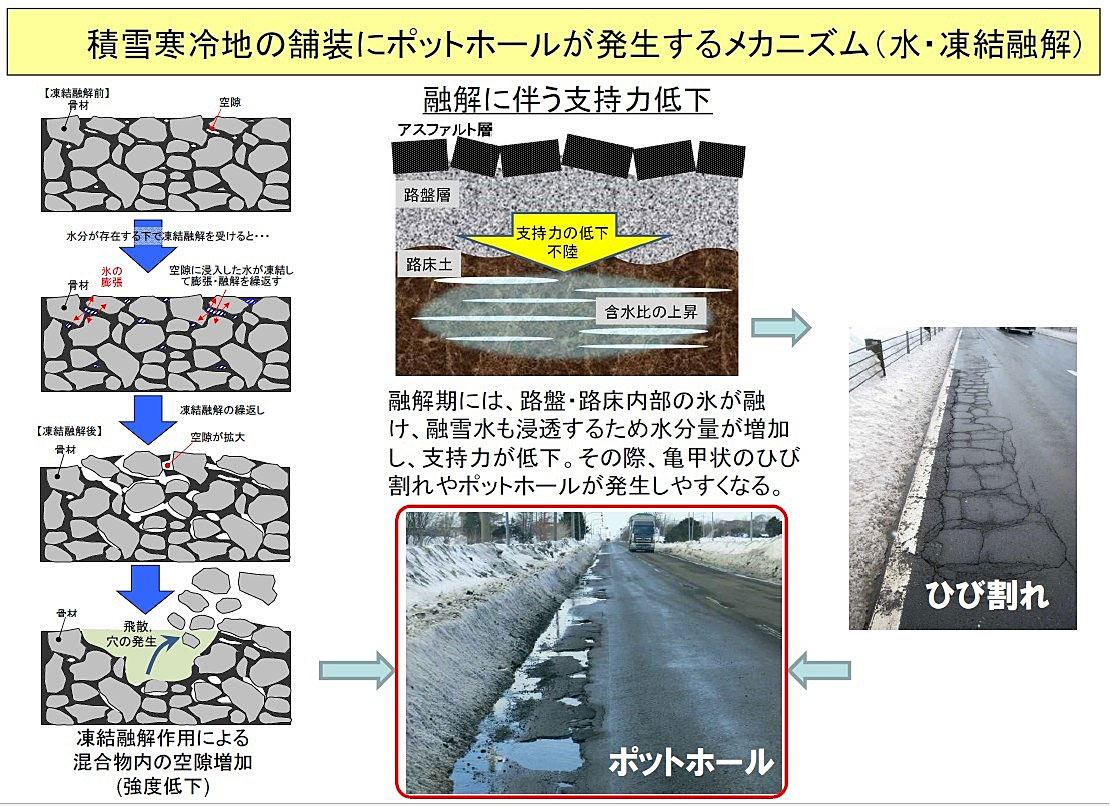 北海道の道路は融雪期になると凍結と融解を繰り返すため、穴ぼこが発生しやすくなります。