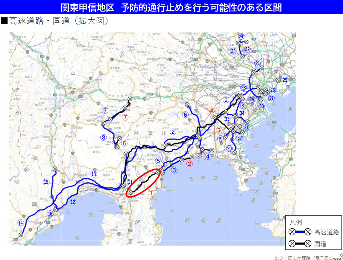 具体的な予防的通行止めの区間は、高速道路では、東名・東京IC〜御殿場IC、新東名・海老名南JCT〜新秦野IC、西湘BP・西湘二宮IC〜箱根口IC・石橋IC、新湘南BP・藤沢IC〜茅ヶ崎海岸IC、小田原厚木道路・小田原西IC〜厚木IC、圏央道・茅ヶ崎JCT〜相模原IC、中央道・都留IC〜河口湖IC、東富士五湖道路・富士吉田IC〜須走IC、東名・御殿場IC〜沼津IC、東名・沼津IC〜清水IC。