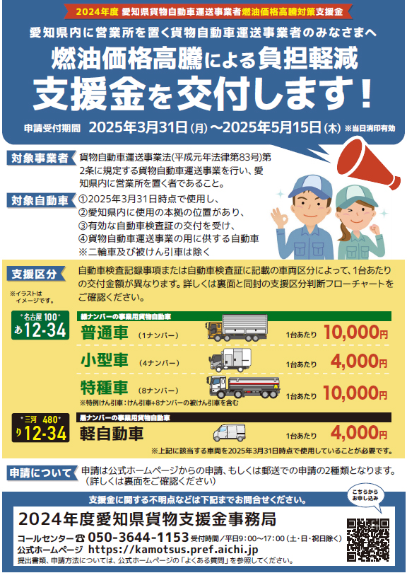 愛知県は3月31日~5月15日、「2024年度愛知県貨物自動車運送事業者燃油価格高騰対策支援金」の申請を受け付ける。