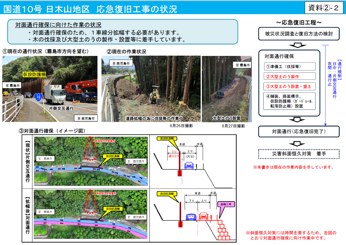 現在、応急的に対面二車線の通行を確保するため、日中片側交互通行、夜間通行止めを行っている。また、国道10号の通行止めによる代替路である東九州道の隼人東IC~加治木IC間を利用する車両は無料で通行できる措置を講じている。