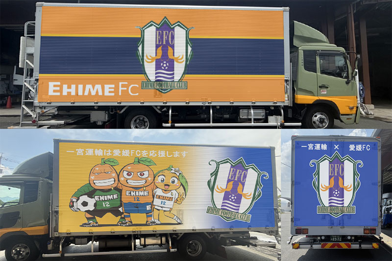 一宮運輸(愛媛県新居浜市)は、このほど愛媛FCラッピングトラックを製作、9月14日のブラウブリッツ秋田戦の荷物運搬より運行を開始し、9月20日のジェフユナイテッド千葉戦では、スタジアム場外で披露された。