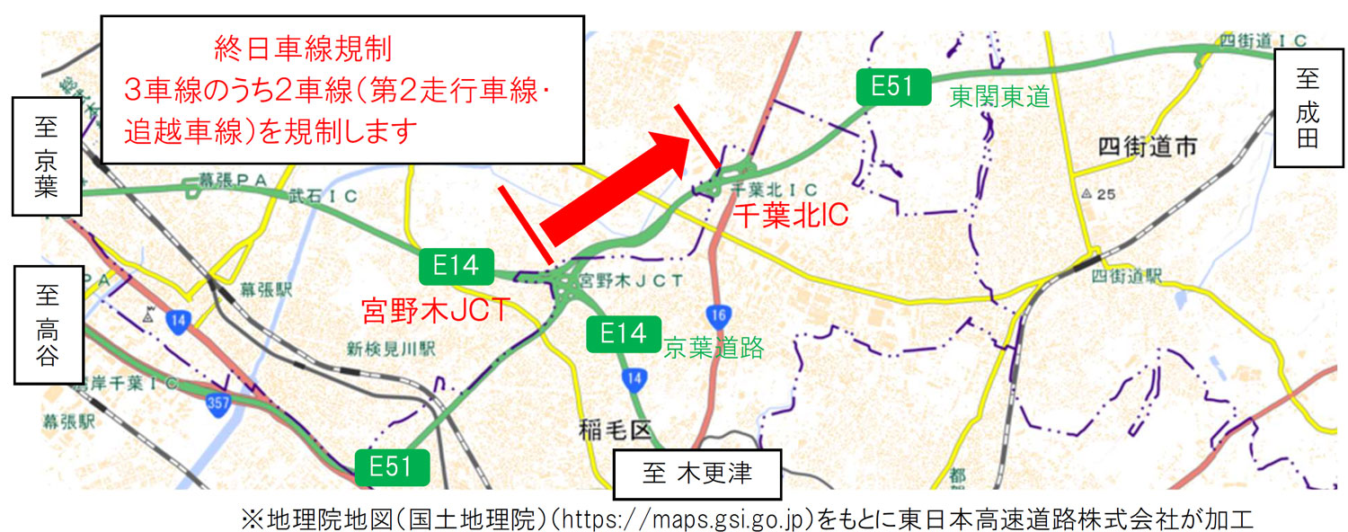 NEXCO東日本千葉管理事務所は、10月19日、26日の各日16時~翌6時、3車線のうち第2走行車線と追越車線の2車線で終日車線規制を実施する。