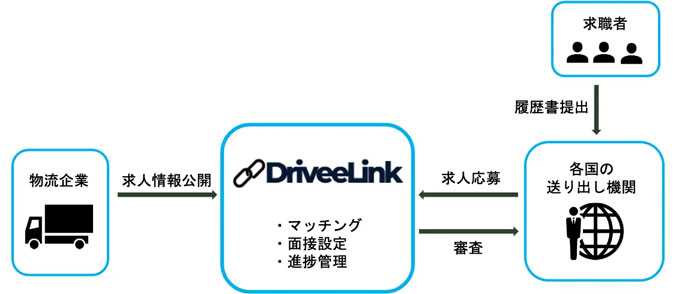 ドライビーリンクは、2025年3月に提供を開始した物流企業と外国人材送り出し機関をつなぐマッチングサービス。企業が求人票を公開すると、送り出し機関がマッチする人材の履歴書をアップロードし、その後、企業と求職者のオンライン面談を経て採用を決定する仕組み。