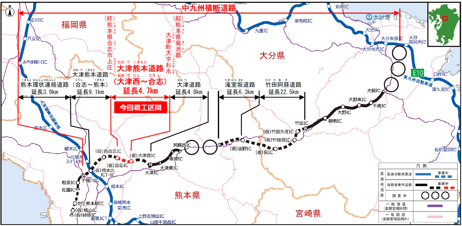 大津熊本道路(大津西~合志)は、2022年度から事業着手し、これまで、測量設計、用地買収を進めていた。