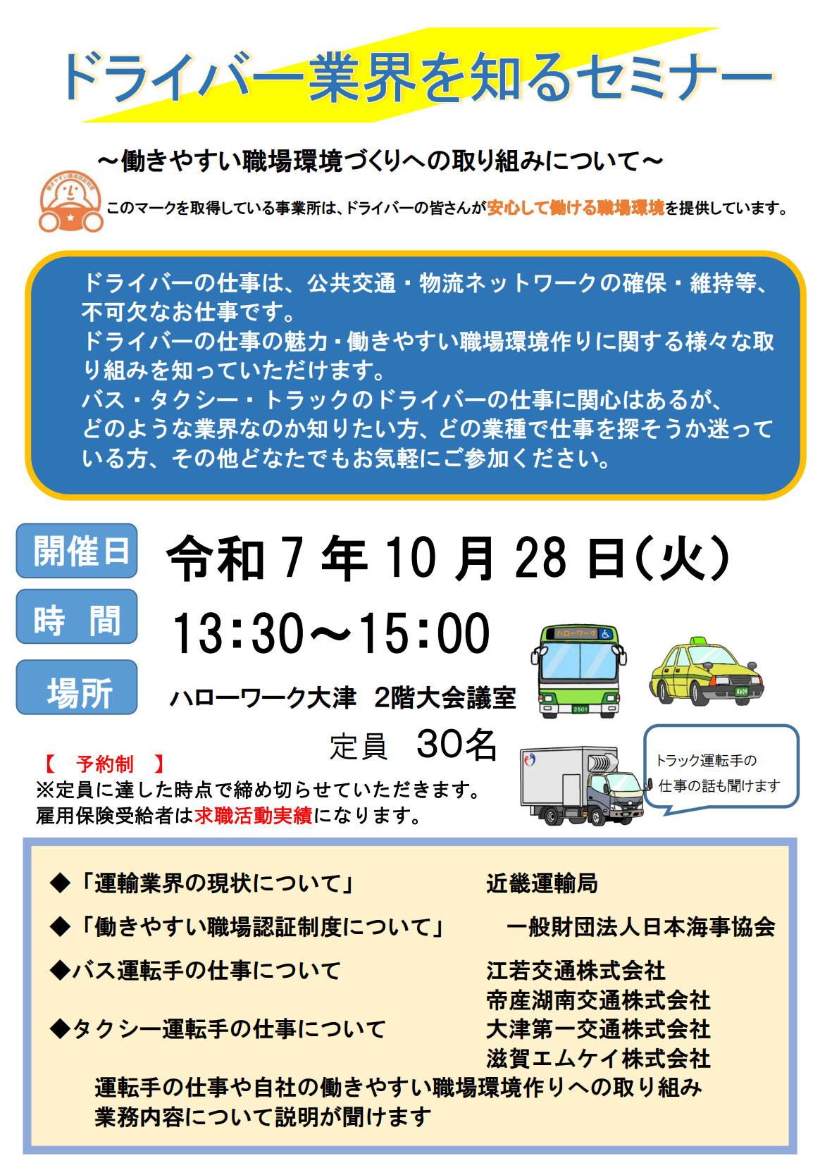 - ハローワーク大津/「ドライバー業界を知るセミナー」10月28日開催 (10月17日)