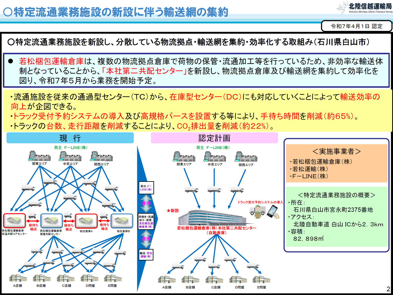4月1日付けで、若松梱包運輸倉庫、若松運輸、F-LINEによる「特定流通業務施設の新設に伴う輸送網集約」の取り組みを認定した。