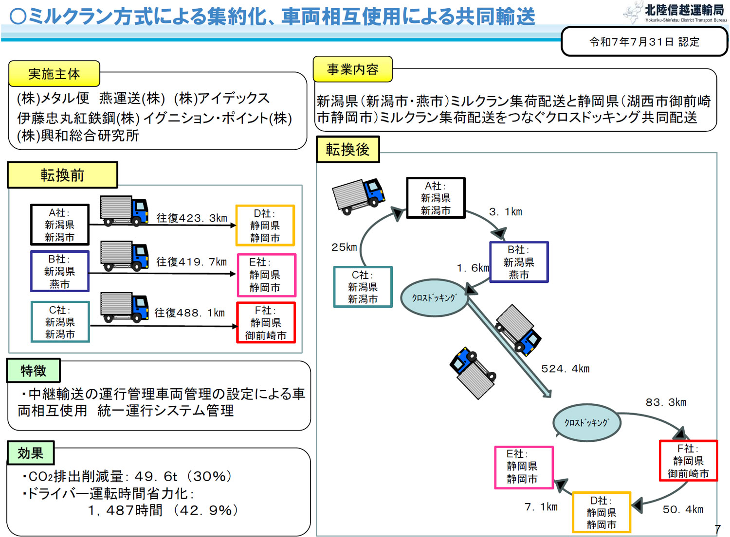 7月31日には、メタル便、燕運送、アイデックス、伊藤忠丸紅鉄鋼、イグニション・ポイント、興和総合研究所による、ミルクラン方式による集約化、車両相互使用による共同輸送を認定した。