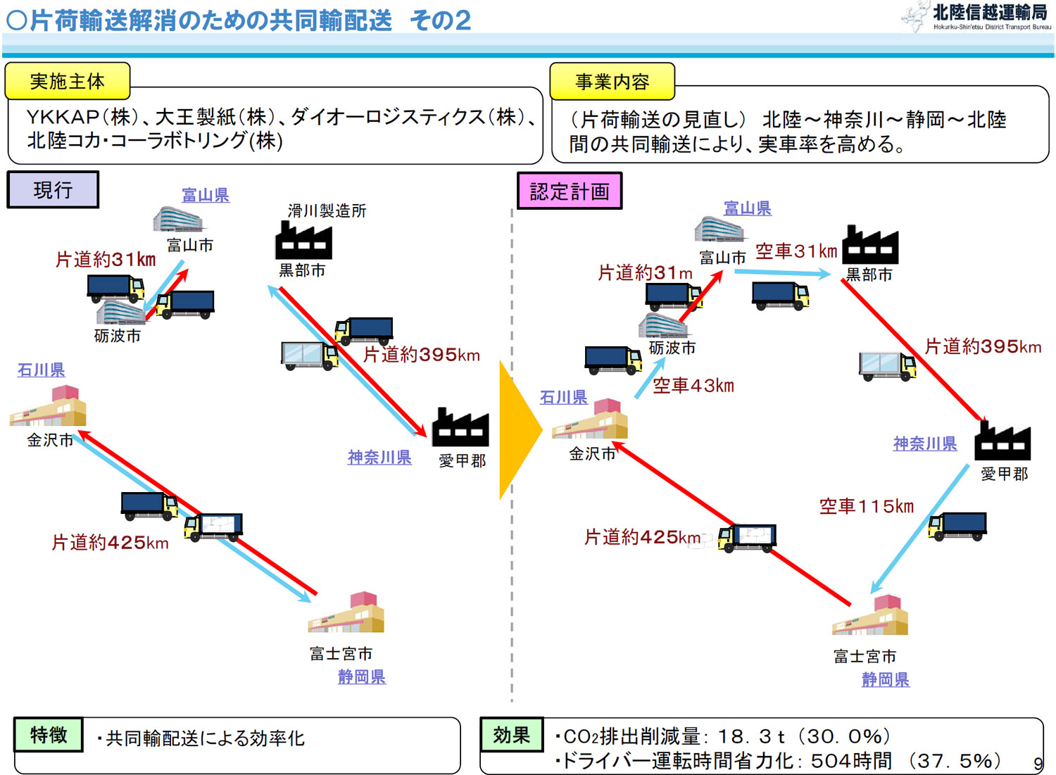 今回、「北陸~埼玉~静岡~北陸」間、「北陸~神奈川~静岡~北陸」間の共同輸送により、実車率を高めた。