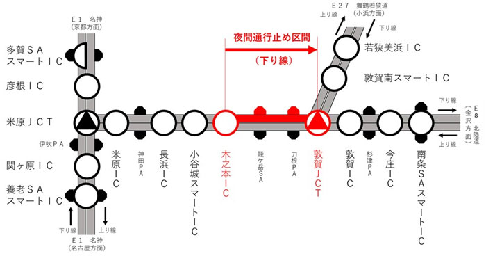 NEXCO中日本は11月17日(月)~20日(木)、北陸道・木之本IC~敦賀JCT(下り線)を夜間通行止めにする。