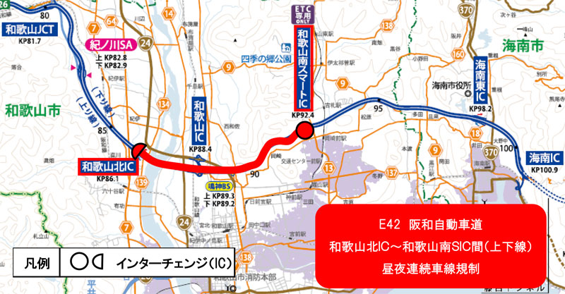 NEXCO西日本は、10月27日(月)~2026年2月下旬まで、阪和道・和歌山北IC~和歌山南スマートIC(上下線)で昼夜連続車線規制を実施する。