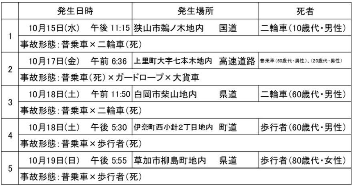 - 埼玉県/10月15日~19日に交通死亡事故5件で「交通死亡事故多発警報」発令 (10月21日)
