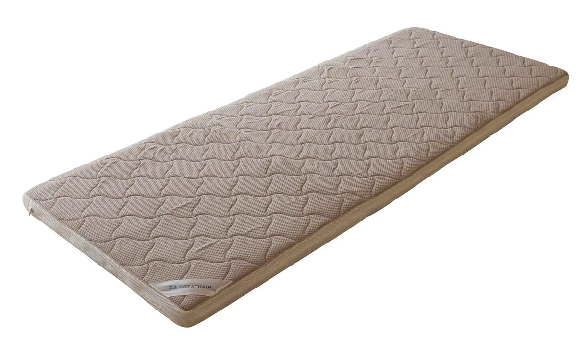 ブレスエアーは東洋紡が開発したポリエーテルエステルエラストマー繊維による三次元網状繊維構造体で、通気性・耐久性・クッション性に優れている。
