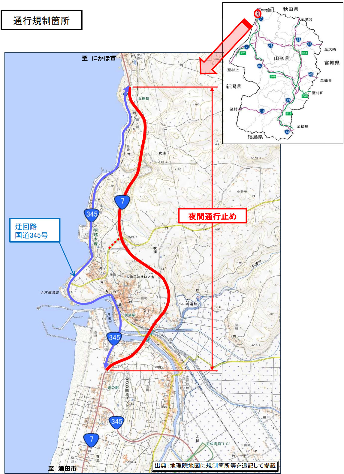 東北地方整備局酒田河川国道事務所は、11月24日(月)~26日(水)各日20時~翌5時、国道7号・山形県飽海郡遊佐町菅里字菅野地内~山形県飽海郡遊佐町吹浦字茨畑地内で、遊佐象潟道路改築事業に伴う橋梁撤去工事のため、夜間全面通行止めを行う。