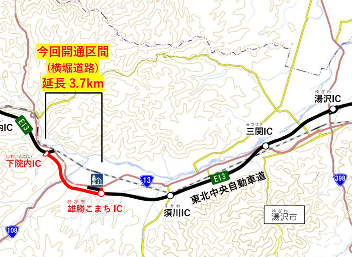 東北地方整備局湯沢河川国道事務所が整備を進めていた、東北中央道・下院内IC~雄勝こまちIC間3.7km(横堀道路)が、11月22日(土)15時に開通する。