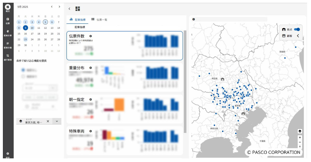 パスコは10月28日、クラウド型配車支援システム「LogiSTAR Geospatial LINKS -Local(ロジスター・ジオスペーシャルリンクス・ローカル)」に、伝票情報を可視化する「ダッシュボード機能」を追加した。