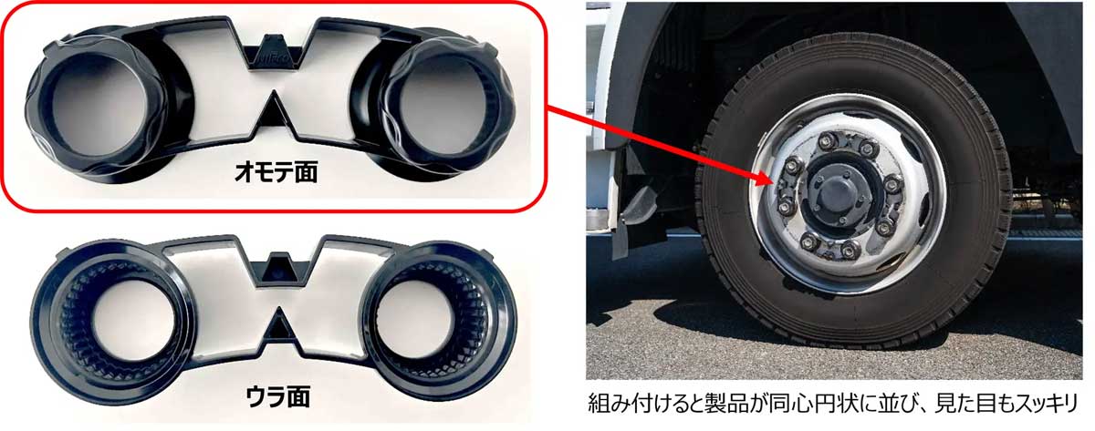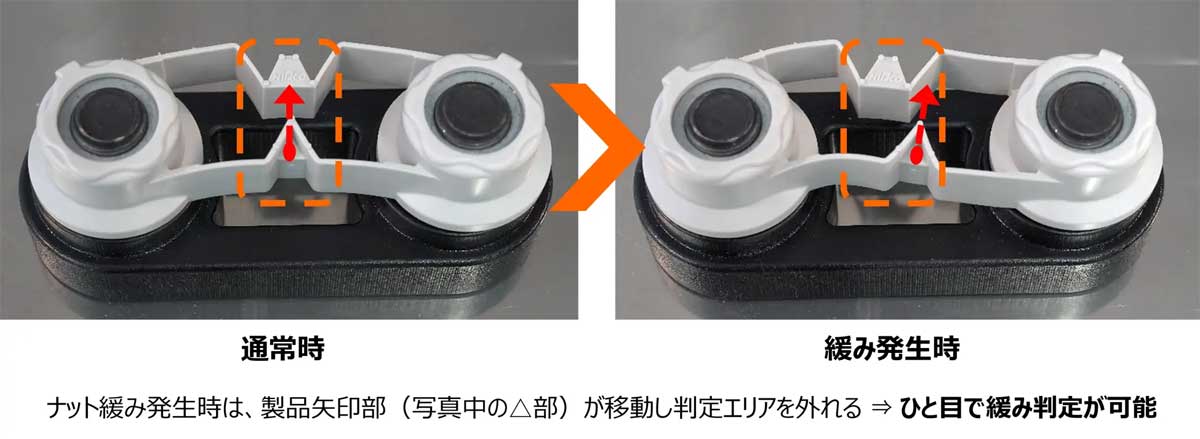 ホイールナットの緩みに応じてインジケーター部が可動し、製品矢印部が判定エリアを外れることでナットの増し締めが必要な緩み角度がひと目で正確に判定できる。またナットへの圧入設計の見直しによって、より軽く、確実な装着が可能な他、オモテ・ウラを間違えないユニバーサルデザイン形状により誤組み付けを防ぐ工夫もされている。