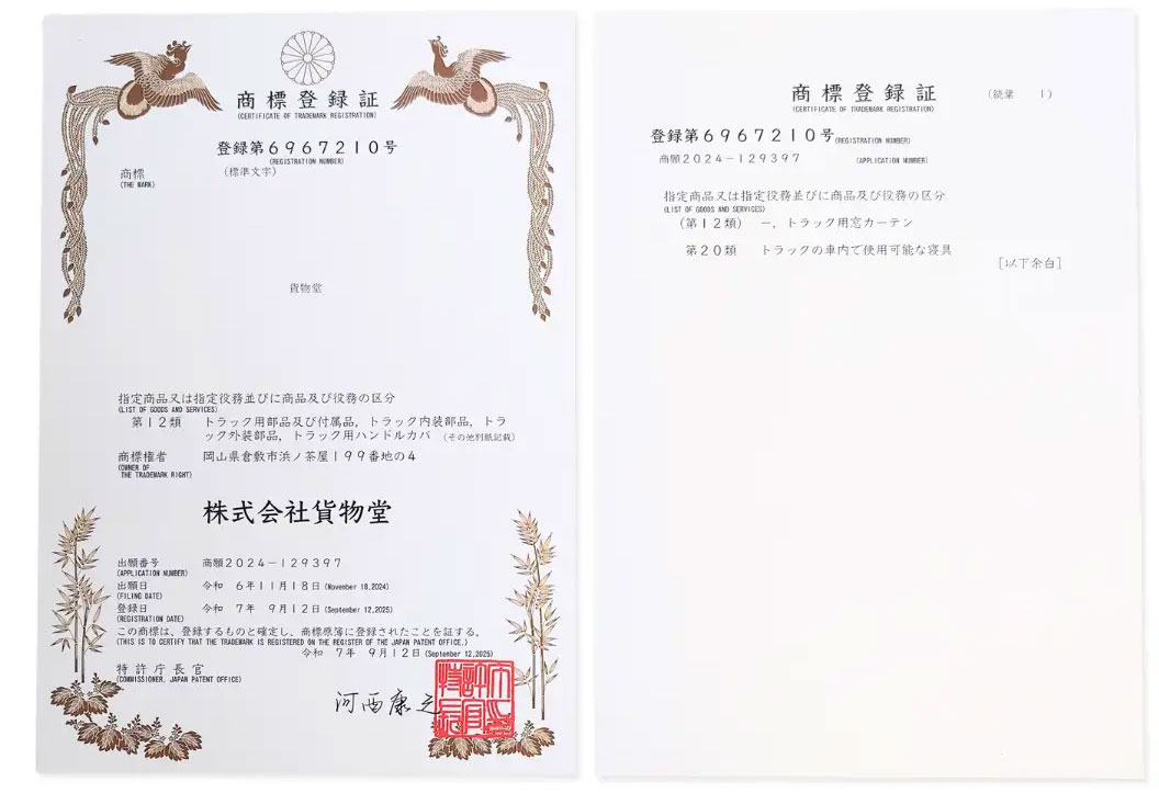 創業40年を迎える貨物堂は、長年の経験を活かし、トラックドライバーや物流業界の利用者が安心して使用できる商品を企画・開発してきた。今回の商標登録は、同社ブランドの認知向上を目的として行われたもので、2024年11月18日に商標出願し2025年9月12日に登録が完了した。