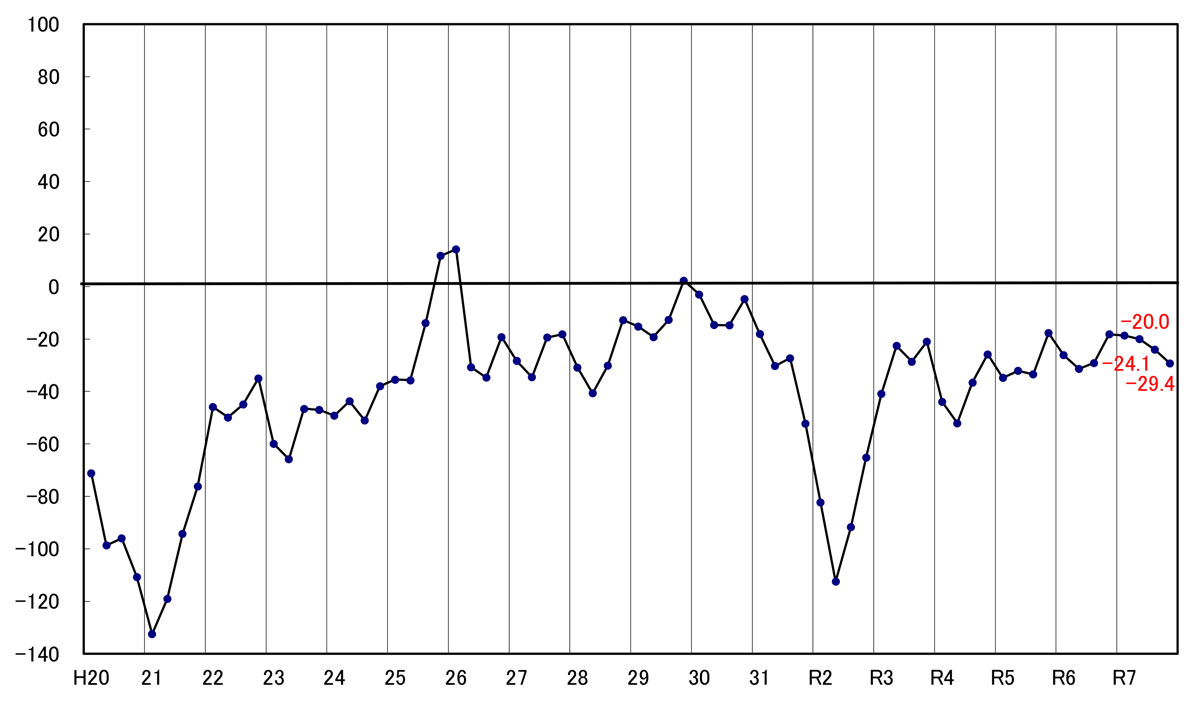 なお来期の見通しは、事業環境の不透明感や人材不足、物価上昇等から、今回▲24.1から▲29.4へと5.3ポイント悪化する見込みとしている。