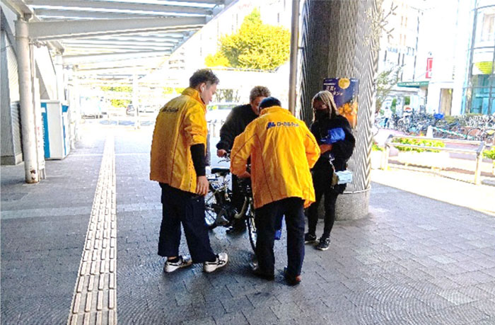 活動は巽本部長の挨拶から始まり、駅前を通行する人々に声をかけ、防犯対策のための自転車前かごカバーを配布した。配布の際には、受け取った人に取り付け方法を説明しながら作業を進め、用意していた200枚のカバーを約1時間で配り終えた。