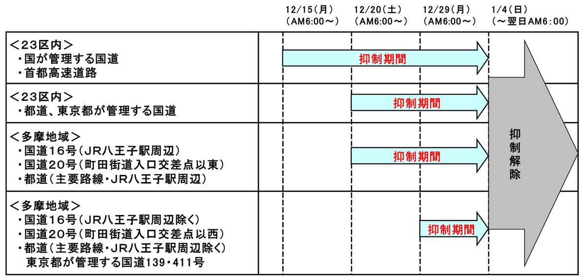 また多摩地域では、12月20日からJR八王子駅周辺の国道16号、町田街道入口交差点以東の国道20号、主要路線・JR八王子駅周辺の都道での工事を抑制。
