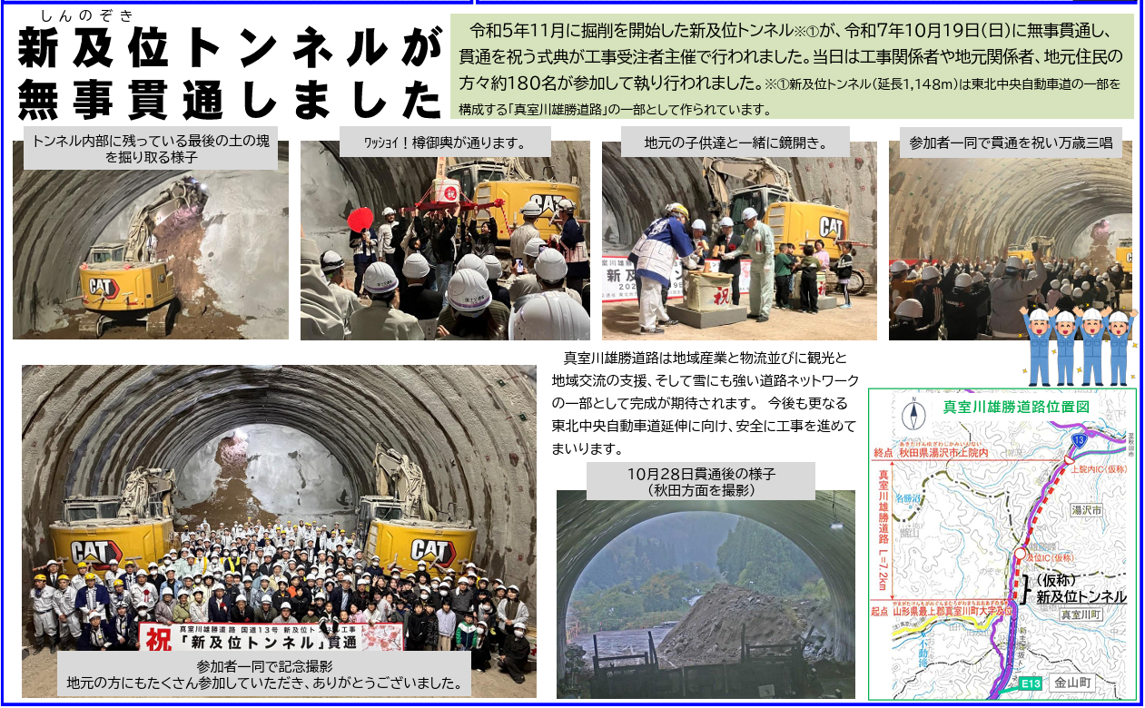 2023年11月に掘削を開始した新及位トンネルが、2024年10月19日に無事貫通した。貫通を祝う式典を工事受注者主催で実施した。当日は工事関係者や地元関係者、地元住民など約180人が式典に参加した。