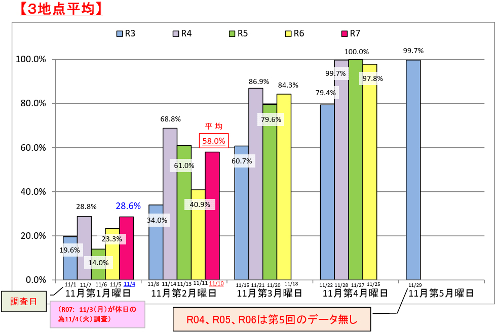 調査は11月10日に実施した。国道46号仙岩峠付近・野中交差点(仙北市田沢湖生保内)の41.9%(前年40.6%、前回13.9%)、国道13号雄勝峠付近・新万石橋交差点(湯沢市横堀)72.0%(前年58.0%、前回 28.0%)、国道7号矢立峠付近・白沢交差点(大館市白沢)61.0%(前年24.0%、前回 45.0%)。