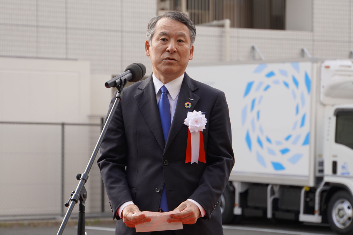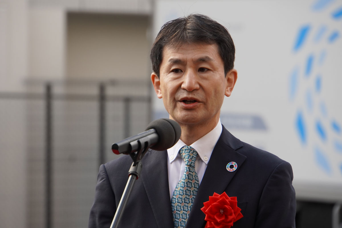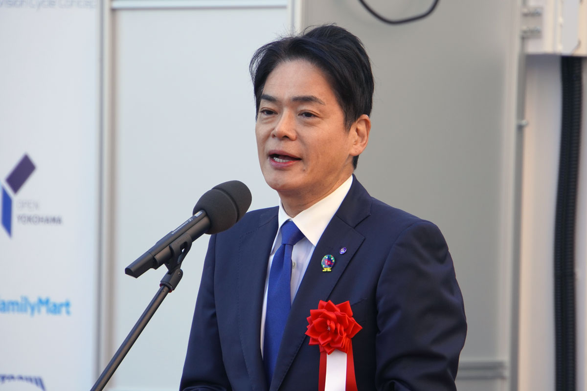 横浜市の山中竹春市長は「横浜市のCO2排出量の約2割が運輸部門。その運輸部門に欠かせないのが配送車であり、配送車の脱炭素化が必要」と指摘。その上で「配送車を24時間使う必要があるコンビニの配送車をバッテリー交換式EVにすることは、我が国の脱炭素化を進める大きな一歩になる」とし、「2027年には、ここ横浜で環境に優しい社会をテーマとするグリーンEXPOが開催されます。(今回の実証は)まさに環境に優しい未来の社会を体現する、その第一歩になるものと考えています」と期待を語った。