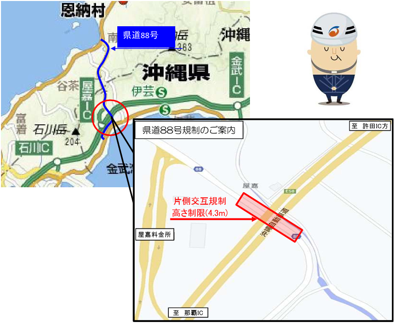 沖縄県は11月17日(月)~2026年6月30日(火)、県道88号線で終日片側交互規制と高さ制限(4.3m)を実施する。