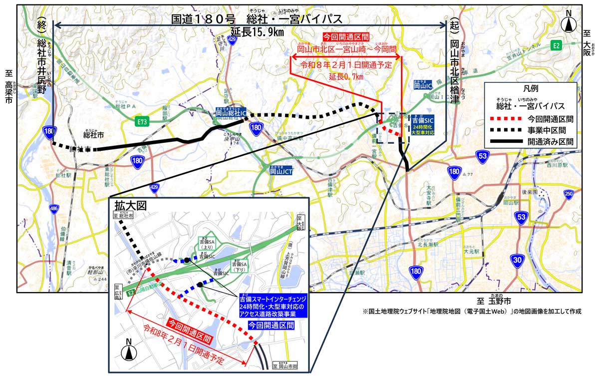 吉備スマートICは、山陽道・吉備SAを活用して設置した簡易型のインターチェンジ。これまで立地条件により利用時間、利用可能車種が制限されていたが、中国地方整備局岡山国道事務所が整備を進め、同時開通する国道180号総社・一宮バイパス(岡山市北区一宮山崎~北区今岡・延長0.7km)と接続することで利用時間、利用車種の制限が解除される。