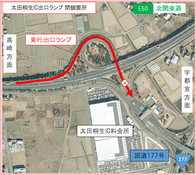 NEXCO東日本は12月8日(月)~11日(木)、北関東道・太田桐生IC出口ランプを舗装補修工事のため夜間閉鎖する。