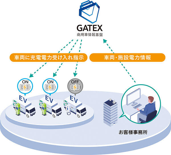 このサービスでは、まずアイ・グリッド・ソリューションズのエネルギーマネジメントプラットフォーム「R.E.A.L. New Energy Platform」が施設の電力使用量の実績・予測データを分析。その結果を、いすゞの商用車情報基盤「GATEX」に連携し、GATEXが各車両に必要となる最適な充電量を算出、各車両へ充電の受け入れ量を指示する。