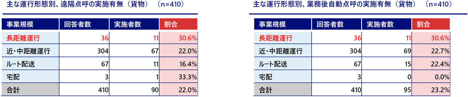 業務後自動点呼を実施していたのは、長距離運行11社(30.6%)、近・中距離運行69社(22.7%)、ルート配送15社(22.4%)、宅配0社(0.0%)となった。
