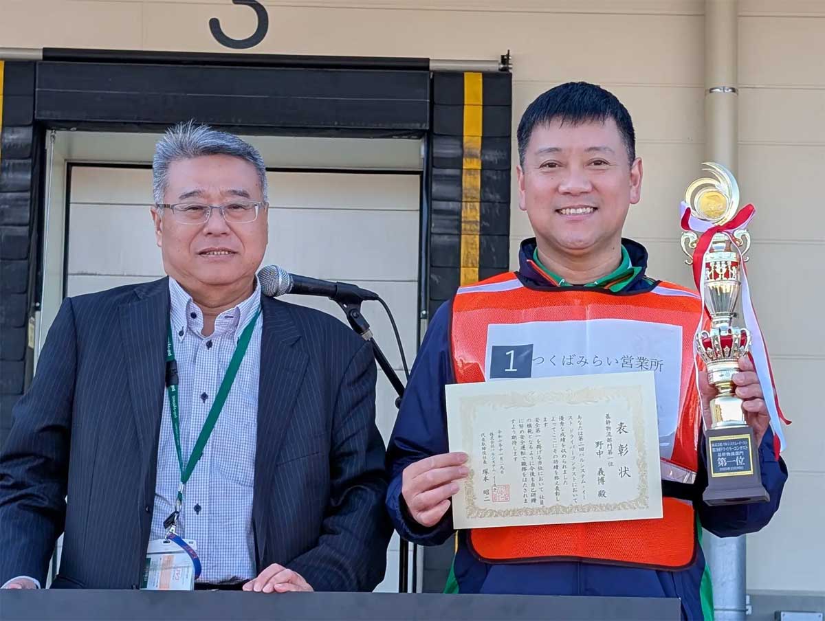 結果は「生活物流部門」では松戸営業所の軣木(とどろき)郁弥さん、「基幹物流部門」では野中義博さんが優勝し、社長賞を獲得した。軣木さんは「ただうれしいのひと言」と喜びを述べ、野中さんは「職場の皆さんが指導してくれた賜物。これからも無事故無違反を心がける」と語った。また、受賞者には表彰状とトロフィー、副賞の目録が授与された。