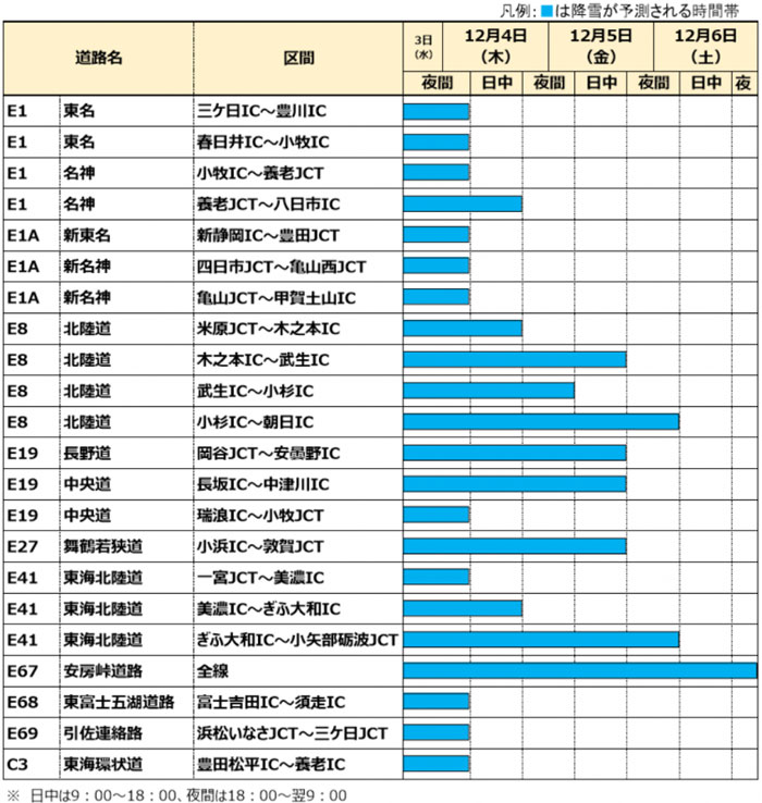管内で降雪が予測されているのは、東名・名神・新東名・北陸道・長野道・中央道・舞鶴若狭道・東海北陸道・安房峠道路・東富士五湖道路・引佐連絡路・東海環状道の各道路。