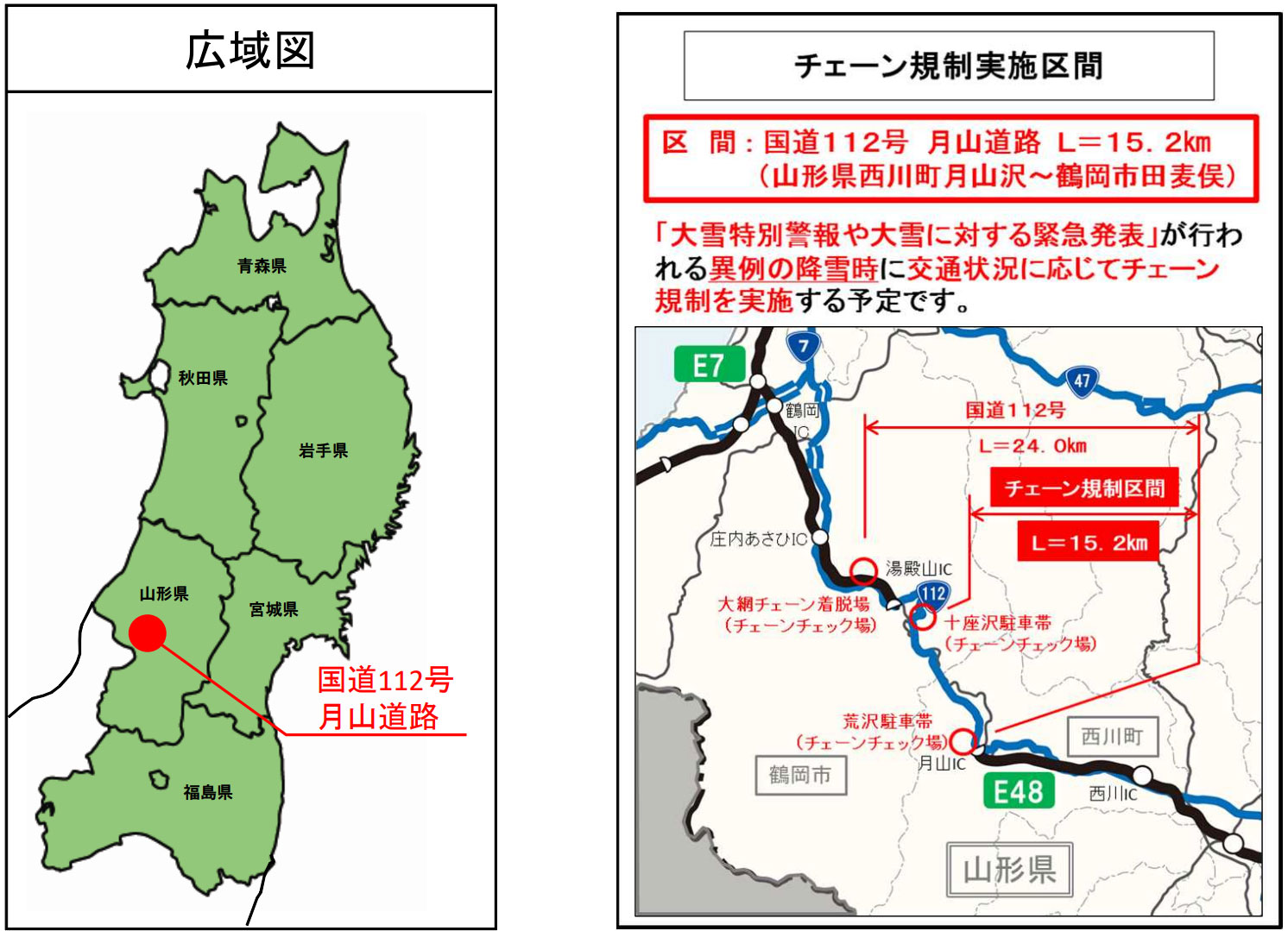 また、今年は、大雪特別警報や大雪に対する緊急発表が行われるような異例の降雪があるときに、チェーン規制を実施。山形県内の国道112号・月山道路において、異例の降雪がある時は、チェーン規制を実施する。
