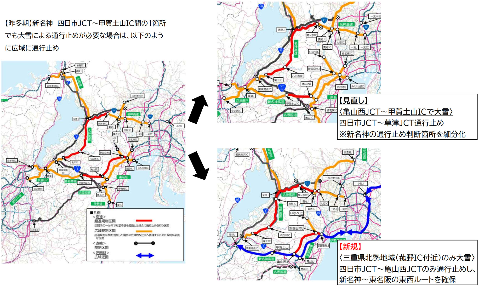 また、今冬期は、新名神の三重県北勢地域のみが大雪となる場合の通行規制パターンを追加し、今冬期より新たに適用することで通行止めの影響を軽減する。