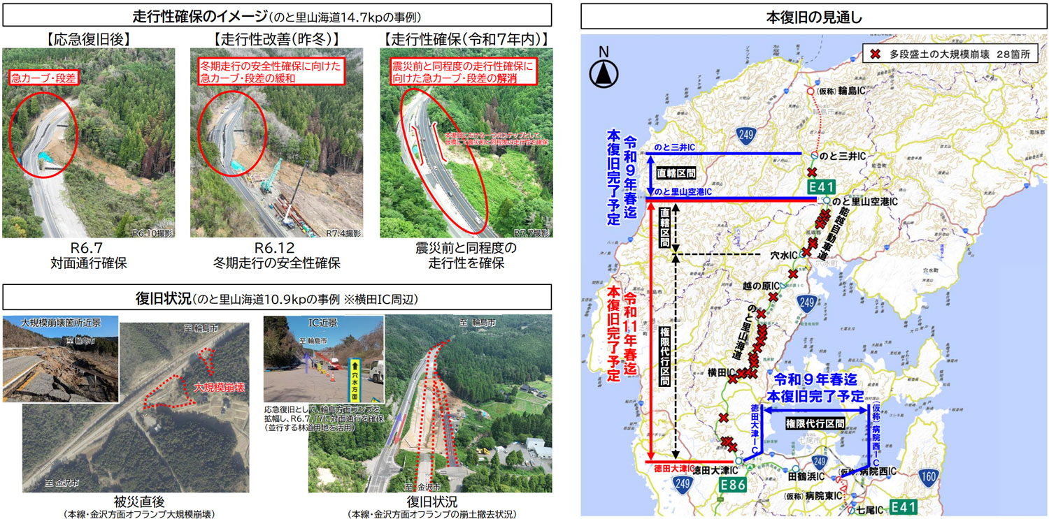能越自動車道等は甚大な被害のあった奥能登地域につながる復旧・復興の大動脈となる路線であり、復旧の費用や期間などを総合的に比較検討した本復旧方針を基に、原位置復旧や既存用地を活用した復旧を実施中であり、2025年内に震災前と同程度の走行性確保(急カーブ・段差の解消)を予定している。