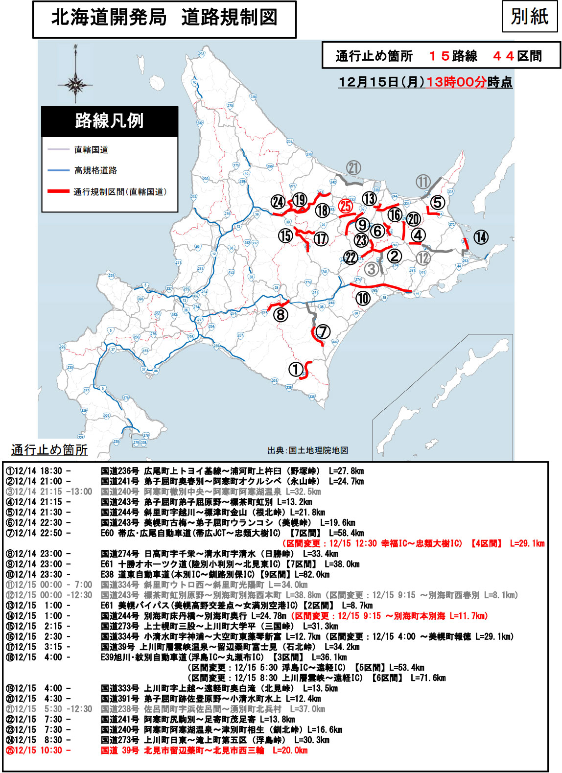 - 北海道開発局/大雪や悪天候で、道東道など15路線・44区間を通行止め(15日13時) (12月15日)