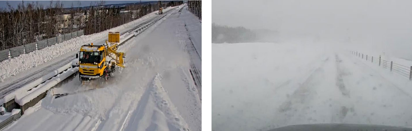 昨日からの大雪による通行止めは、引き続き、上記区間で継続中で、現在、除雪作業を実施し、視界不良の回復を待っておる。
