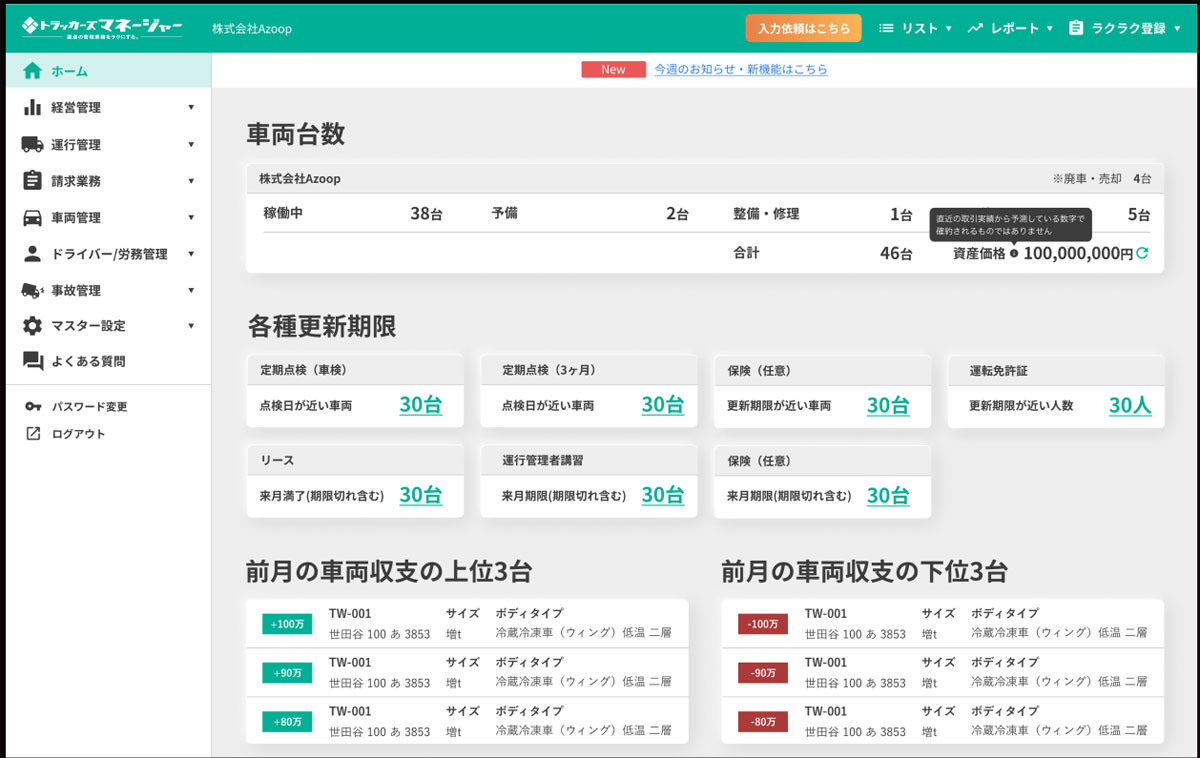 Azoop「トラッカーズマネージャー」は、運送会社の収益性向上や業務効率改善を支援するクラウドベースの運送業務支援システム。車両管理や運行管理機能を備え、従来のExcelや紙ベースで行われていた情報管理をクラウド上で一元化できるほか、請求や売上管理の処理や、トラック1台あたりの収益を集計・可視化する機能も提供している。