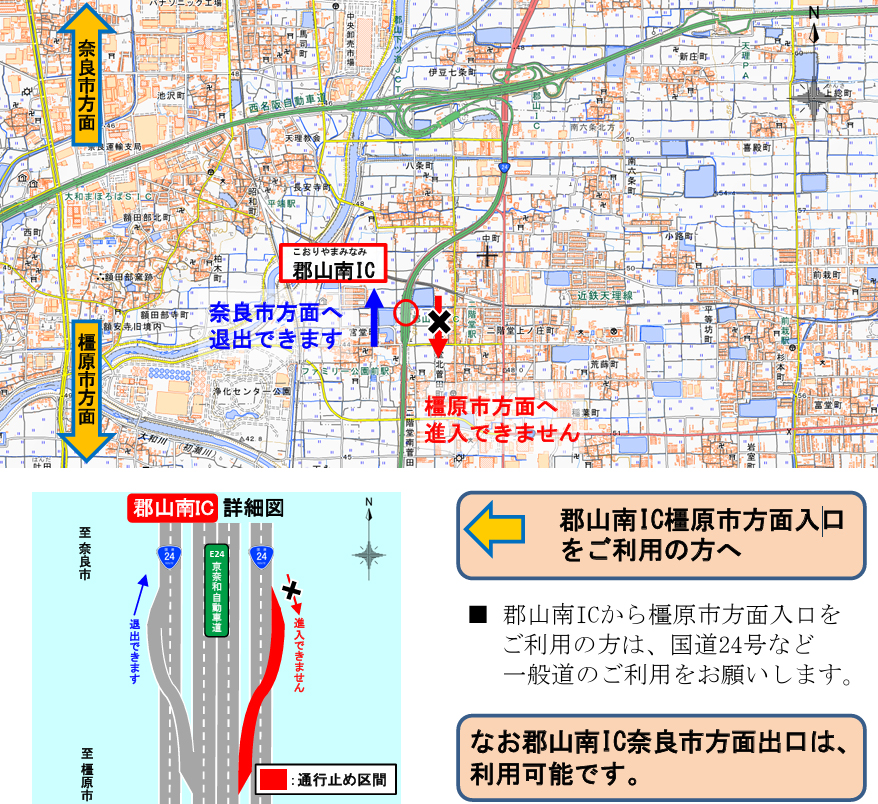 郡山南ICから橿原市方面入口を利用する場合は、国道24号など一般道の利用をお願いしている。なお、郡山南IC奈良市方面出口は、利用可能となっている。