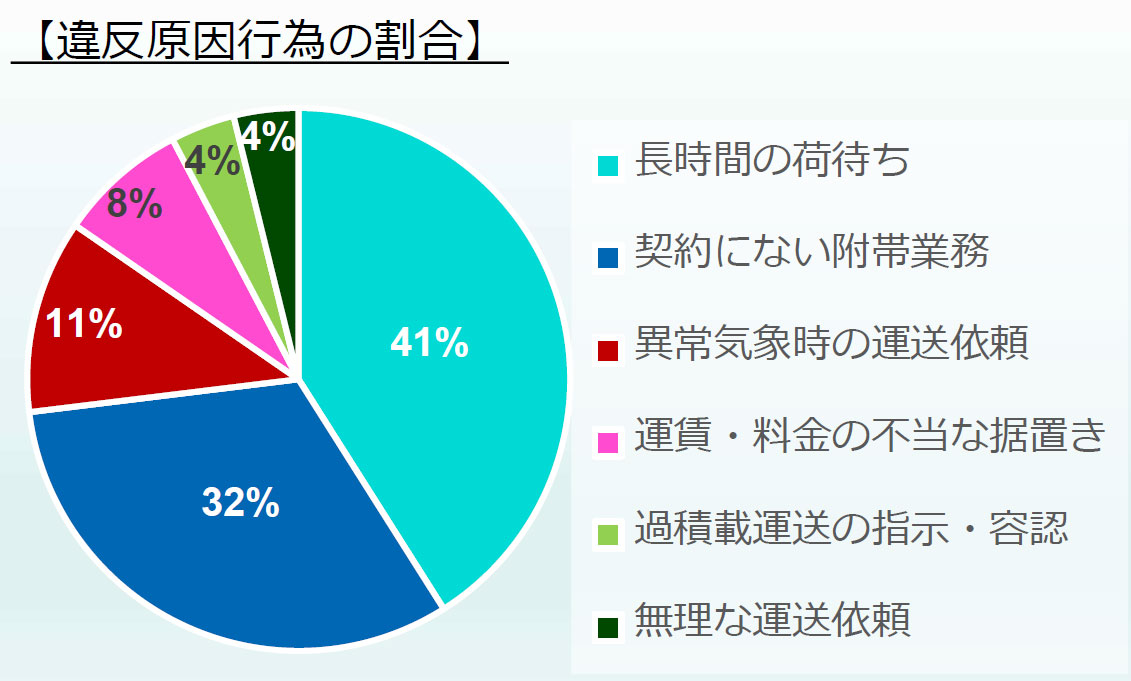違反原因行為の割合は、長時間の荷待ち41%、契約にない付帯業務32%、異常気象時の運送依頼11%、運賃・料金の不当な据置き8%、過積載運送の指示・容認4%、無理な運送依頼4%となった。