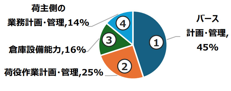 長時間の荷待ちの原因は、「バース計画・管理」45%、「荷役作業計画・管理」25%、「倉庫設備能力」16%、「荷主側の業務計画・管理」14%となった。