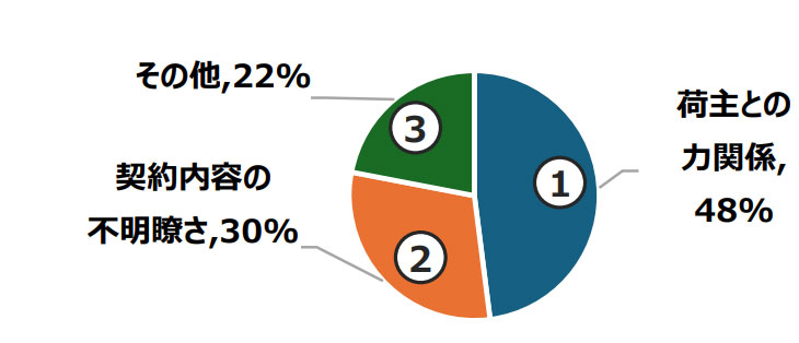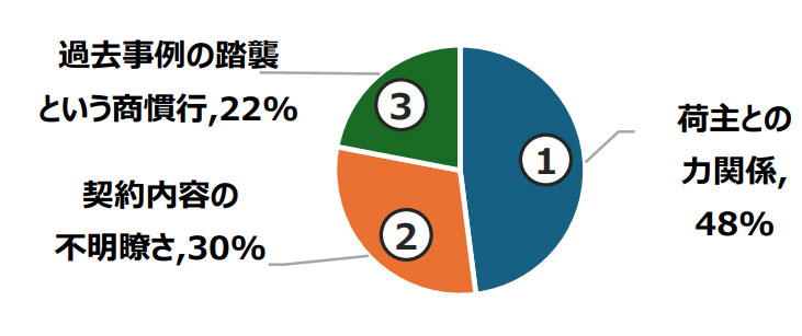 運賃・料金の不当な据置きの原因は、「荷主との力関係」48%、「契約内容の不明瞭さ」30%、「その他」22%。